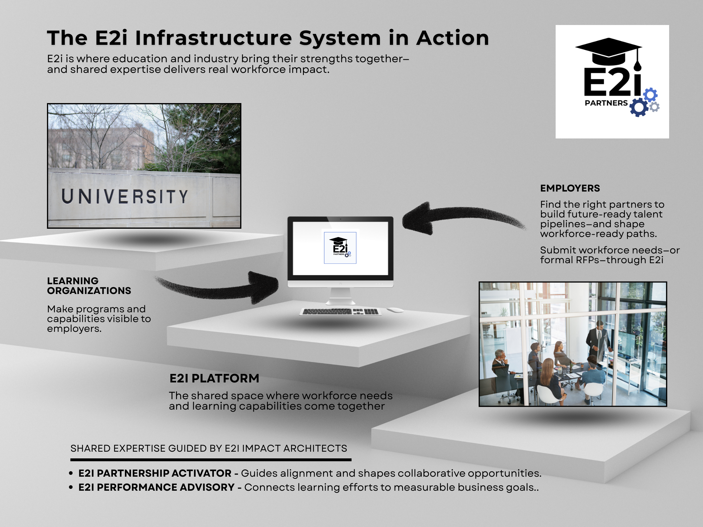 E2i (Education-to-Industry) Partners designs and installs the connective infrastructure that transforms employer alignment from aspiration into measurable, scalable workforce capability.